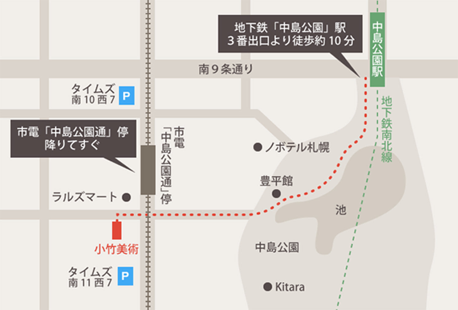 地図上にある赤線に従い中島公園内の「豊平館」を目指し歩いてください。「豊平館」と「札幌コンサートホールKitara」の間の出口を通り、まっすぐ道なりに歩き、信号を一つ渡ると到着いたします。